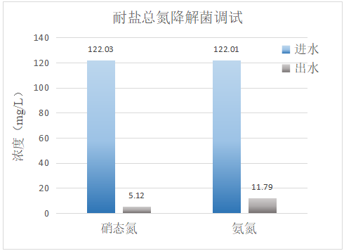 糧果廢水鹽度2%,30℃下經(jīng)過我司耐鹽總氮降解菌的生物調(diào)試后,硝態(tài)氮的去除率超過95%、氨氮的去除率超過90%。
